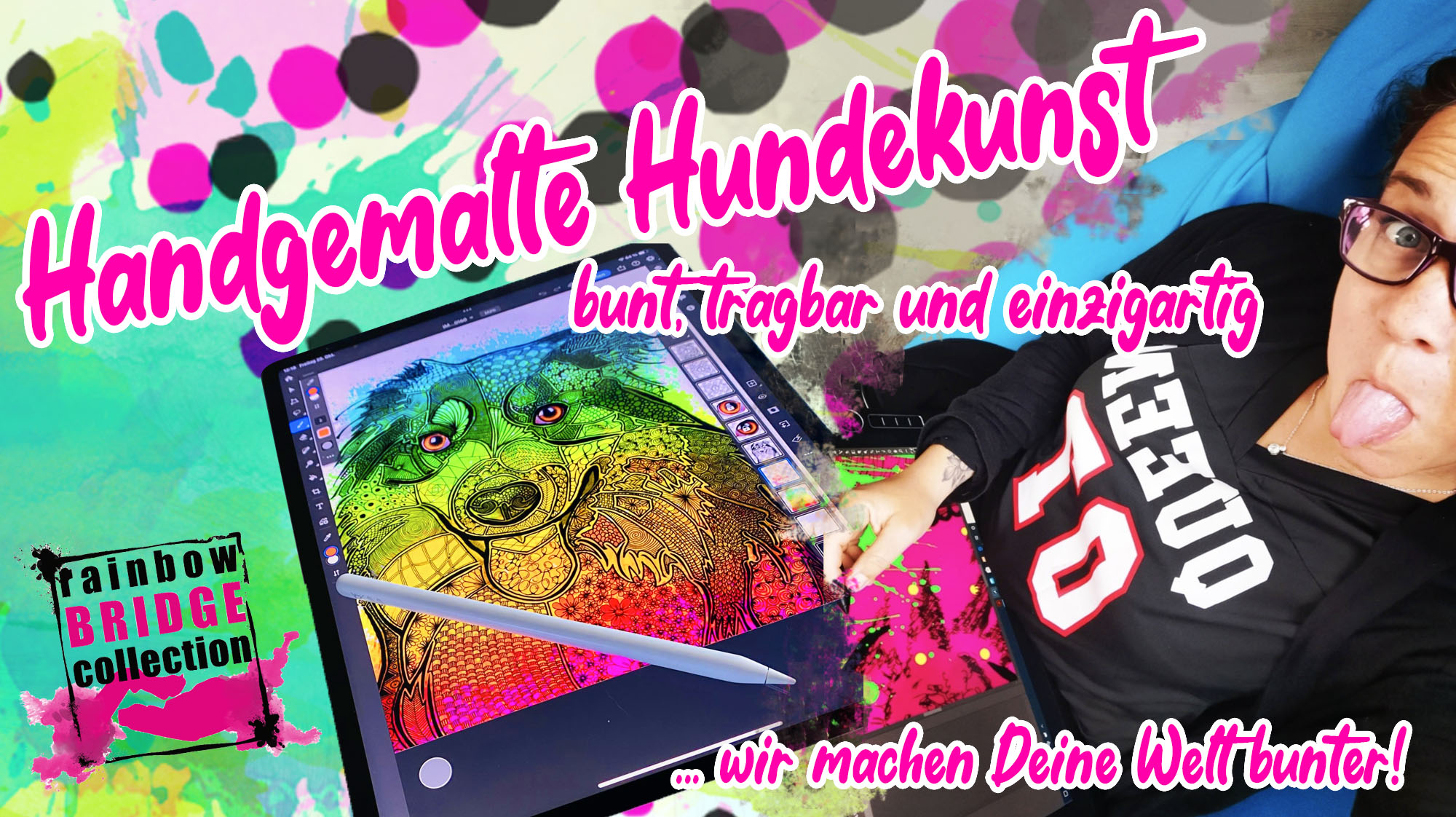 Bring Farbe in graue Tage: Die limitierten Gummistiefel Hazel aus der Rainbow Bridge Collection lassen Regentage leuchten – mit einzigartigem Hundedesign im Popart-Stil, pinker Sohle und ganz viel guter Laune. Stylisch. Bequem. Wasserdicht.