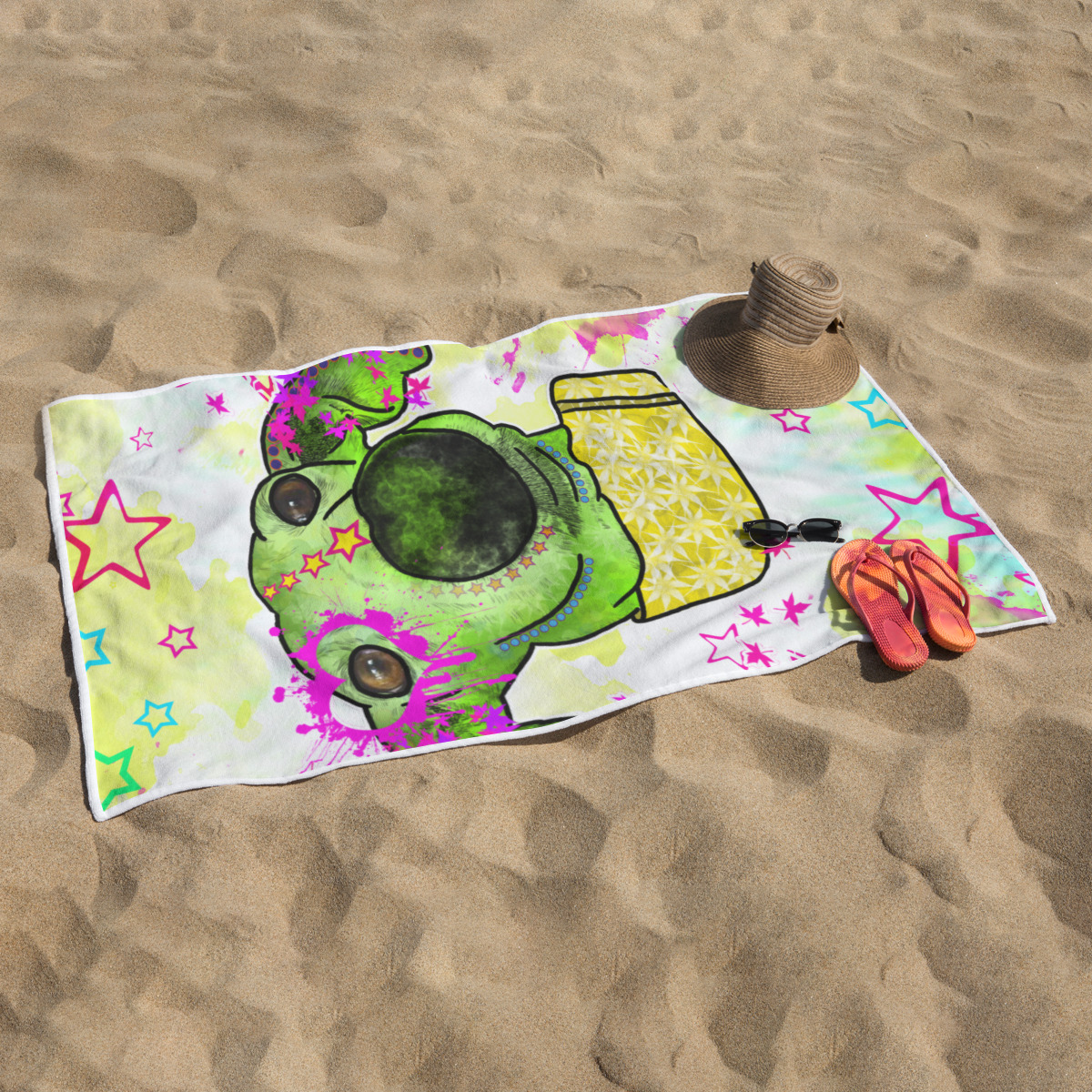 Mit seinem exklusiven Popart-Hundemotiv und den brillanten Farben bringt es nicht nur gute Laune, sondern auch einen Hauch Individualität in deinen Strandtag, Spa-Besuch oder das heimische Badezimmer.