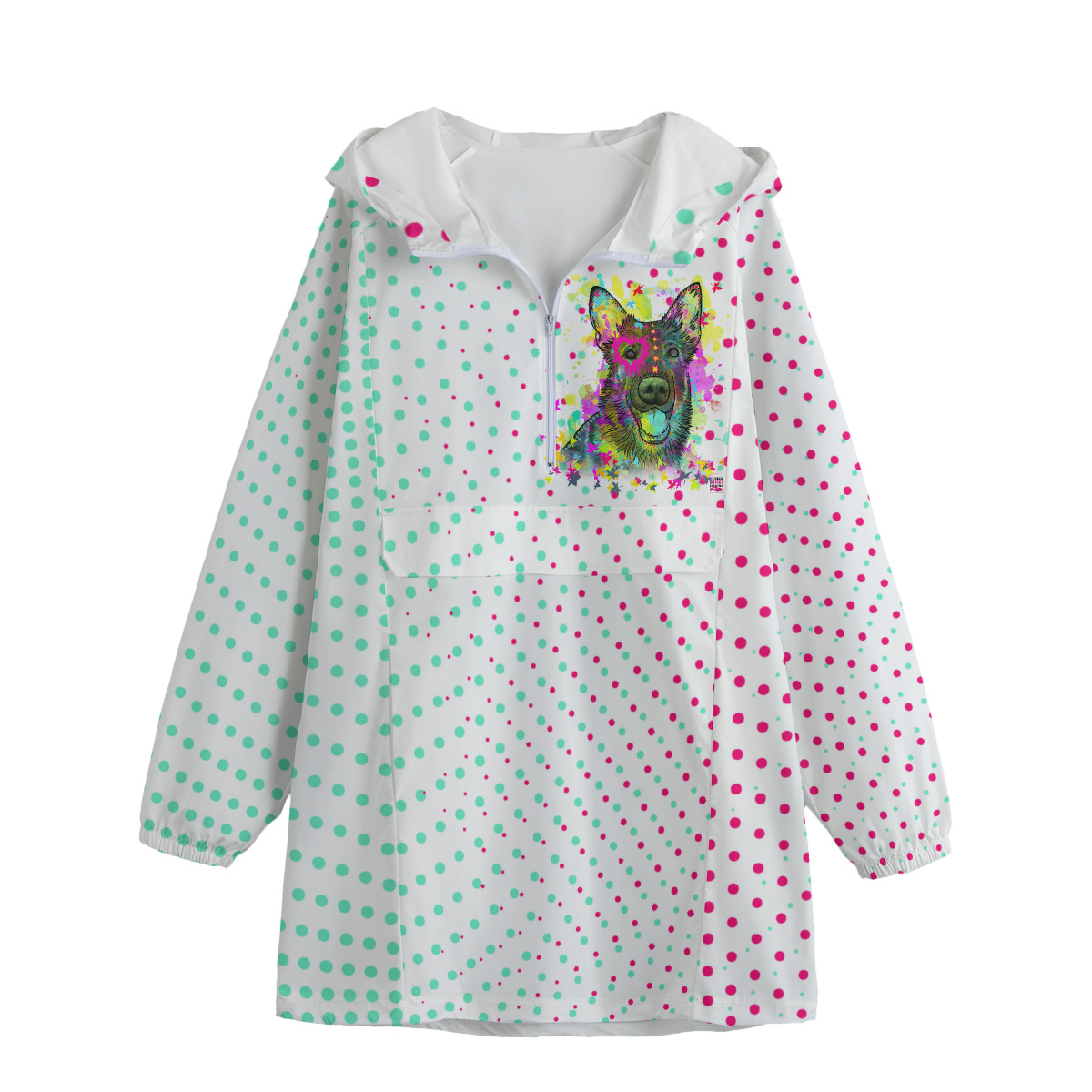 Das farbenfrohe Popart-Hundemotiv setzt modische Akzente und macht die Jacke zu einem Blickfang bei Spaziergängen, in der Stadt oder unterwegs im Alltag. Durch den Schnitt als Schlupfjacke lässt sie sich bequem überziehen, während die zwei seitlichen Taschen praktischen Stauraum bieten.