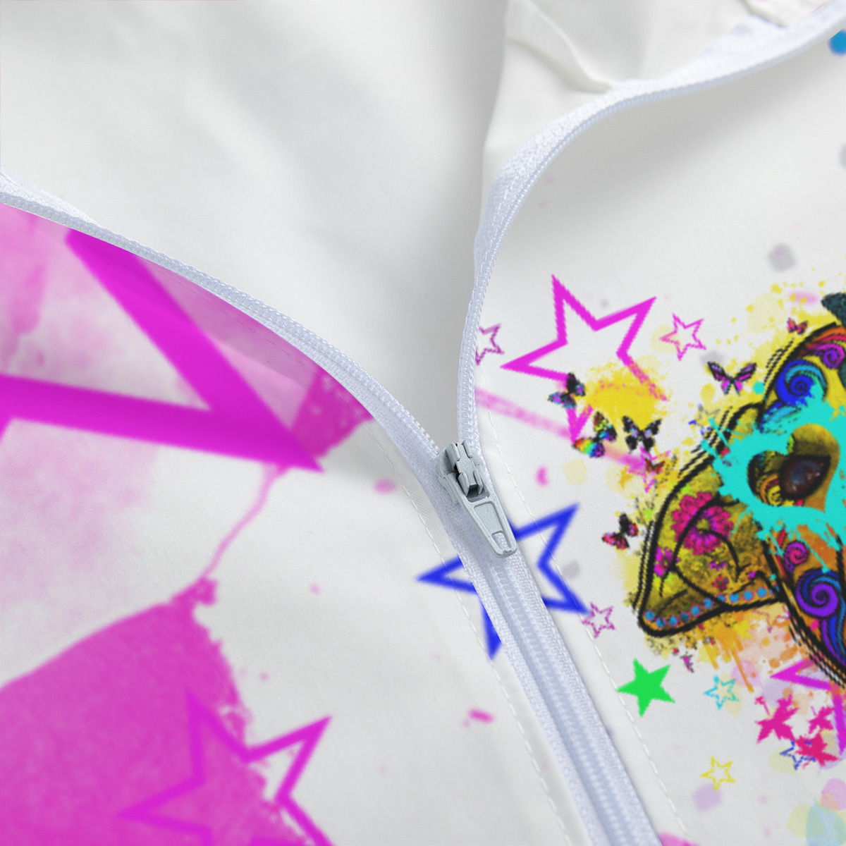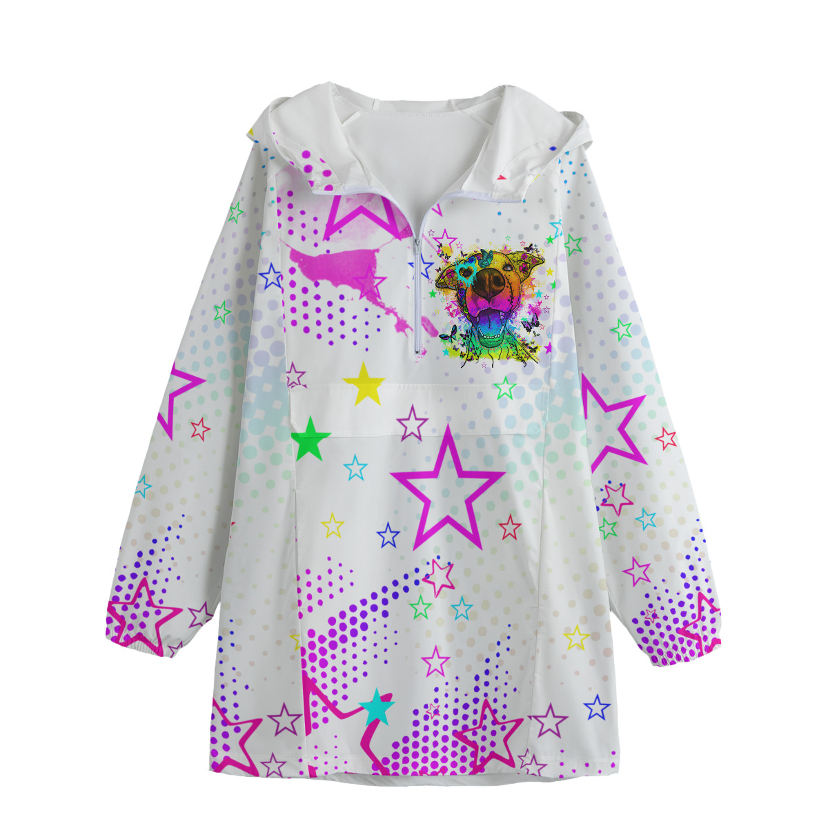 Preview: Leichte Regenjacke Hazel – Popart Hundemotiv, 100 % Polyester, Unisex, Staffordshire, AmStaff, Staff, Pitbull, Pit, SOKA, Listenhund