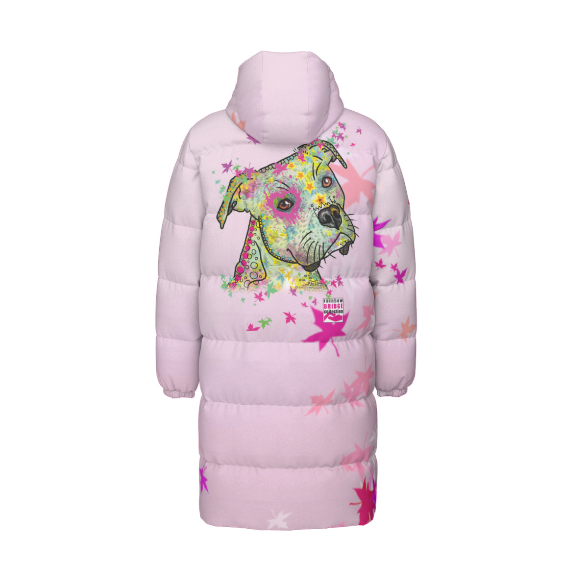 Preview: Warme Wintermantel mit Hundemotiv Calli Callmund – Popart Hundemotiv, 90% Daunen, 10% Federn, bunt, stylisch, AmStaff, Staff, Staffordshire, Pitbull, Pit, Soka, XXL Bulli, Größe XS- 4XL