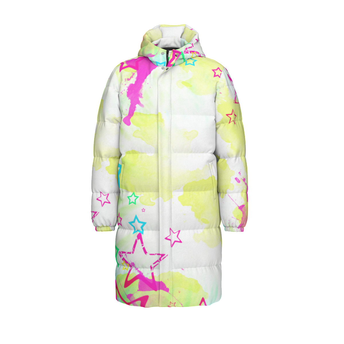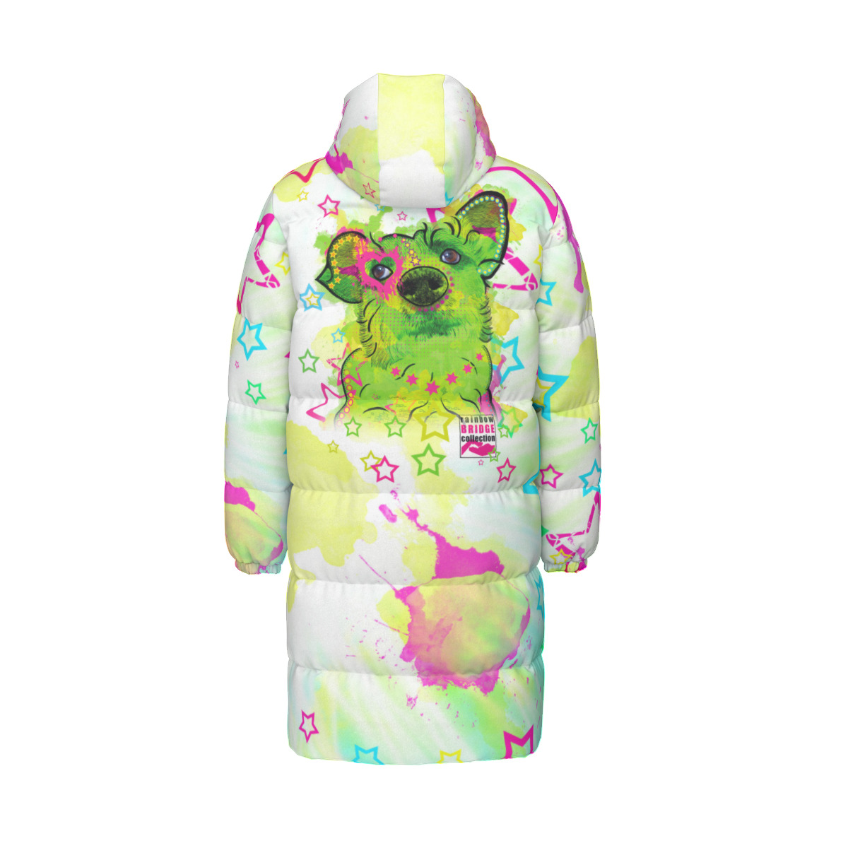 Preview: Warme Wintermantel mit Hundemotiv Luna – Popart Hundemotiv, 90% Daunen, 10% Federn, bunt, stylisch, Mischling, Mix, Größe XS- 4XL