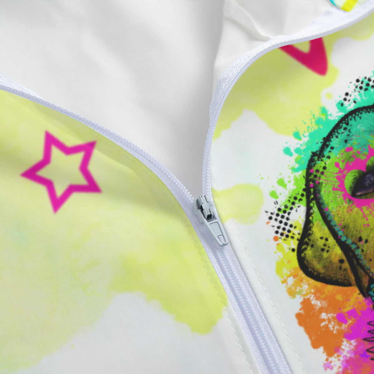 Das farbenfrohe Popart-Hundemotiv setzt modische Akzente und macht die Jacke zu einem Blickfang bei Spaziergängen, in der Stadt oder unterwegs im Alltag. Durch den Schnitt als Schlupfjacke lässt sie sich bequem überziehen, während die zwei seitlichen Taschen praktischen Stauraum bieten.