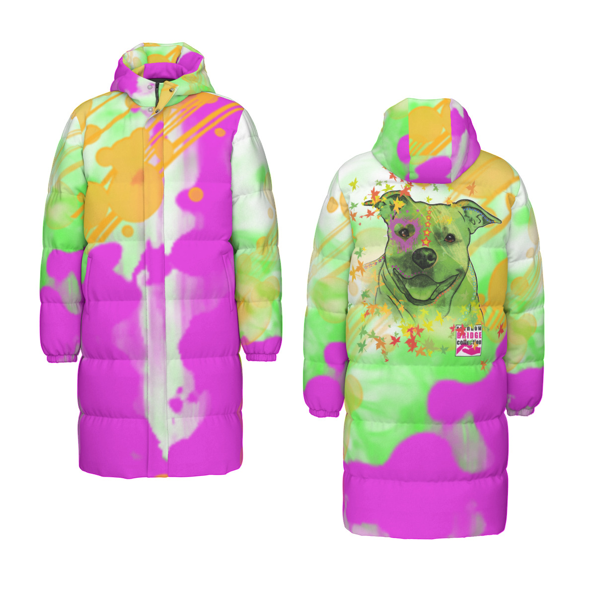 Preview: Warme Wintermantel mit Hundemotiv Angel– Popart Hundemotiv, 90% Daunen, 10% Federn, bunt, stylisch, AmStaff, Staff, Staffordshire, Pitbull, Pit, Soka, Größe XS- 4XL