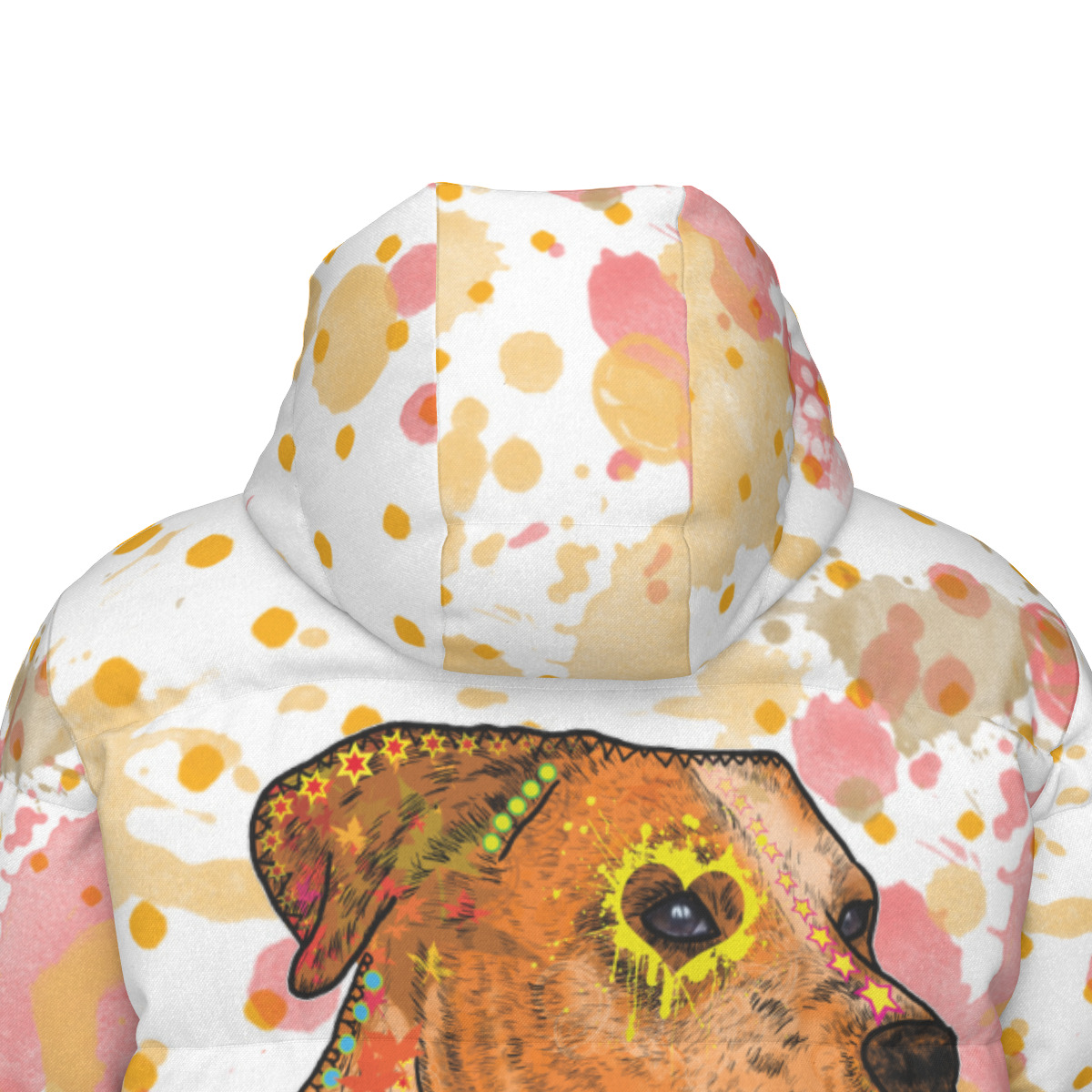 Preview: Warme Wintermantel mit Hundemotiv Bumsi– Popart Hundemotiv, 90% Daunen, 10% Federn, bunt, stylisch, AmStaff, Staff, Staffordshire, Pitbull, Pit, Soka, Größe XS- 4XL